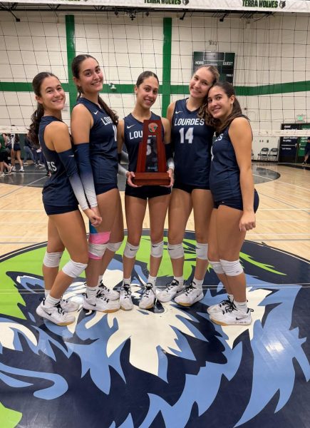 Despite being an away game, students and parents packed the gym in blue, waving the Lourdes flags all round. The team’s biggest fan, Senior Jenna Acosta’s dad, is seen at every game waving the Lourdes flag and getting fans excited.